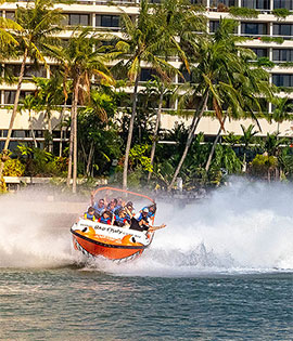 Strap in for 35 minutes of non-stop thrills on Cairns’ waterways. Hold tight as your skipper powers through spins, slides, and sharp turns, sending sprays of saltwater sky-high. It’s fast, fun, and unforgettable – complete with epic waterfront views and plenty of adrenaline.